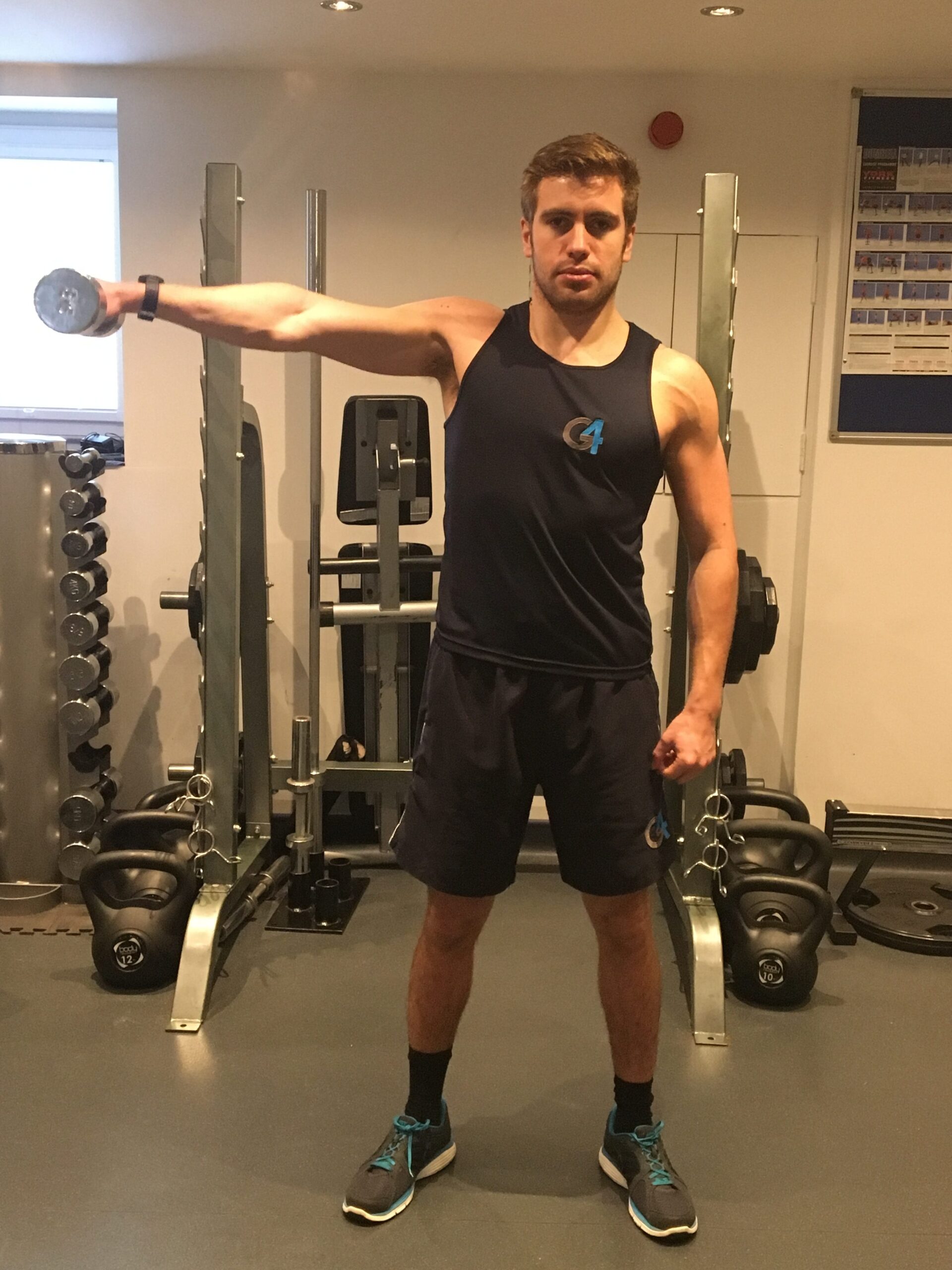 . Thats about 20 to 30 degrees in front of your torso so your arms are at a slight angle when youre raising the weight. Choose a weight which you can move in a controlled smooth motion and avoid using momentum to lift the weights. To do the dumbbell lateral raise follow the steps below.